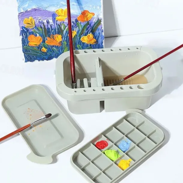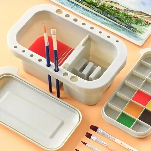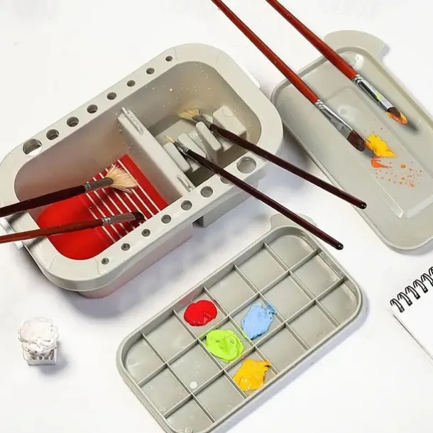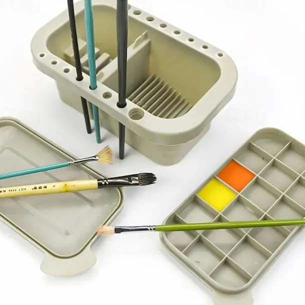 1 Set Multifunctional 3 In 1 Wash Pen Bucket With Pen Holder And Painting Palette Lid Paint Brush Basin Brush Tub Washing Tool For Art Painting Gouache Watercolor Acrylic Oil Painting
