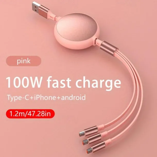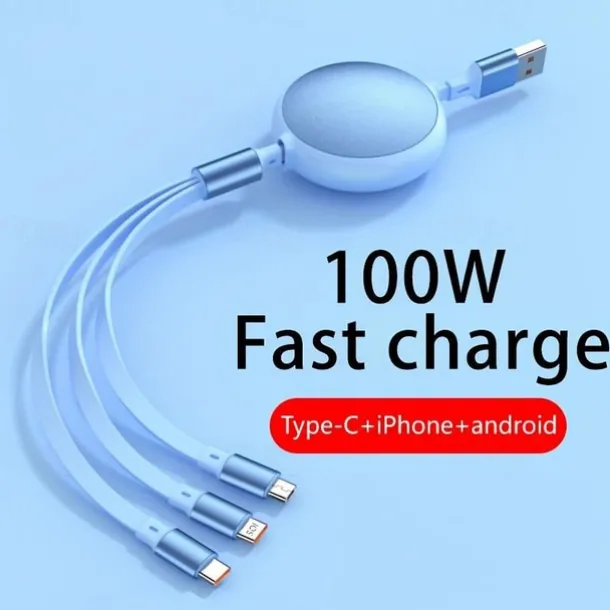 100W Super Fast Charge 3-in-1 Retractable Charging Cable For Apple Android Type-C USB Charge Car Multifunctional Mobile Phone Electronic Accessories