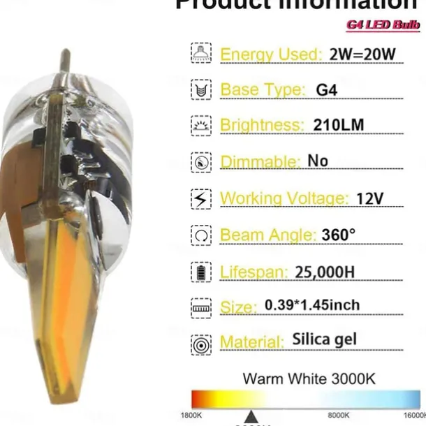 Quantity: 10pcs, LED Beads Quantity: 1, Type: LED Bi-pin Lights, Wattage (W): 2, Voltage (V): 12, Initial Lumens (lm): 200, Color Temperature (k): 3000/6000, Bulb Shape: T, Bulb Base: G4,