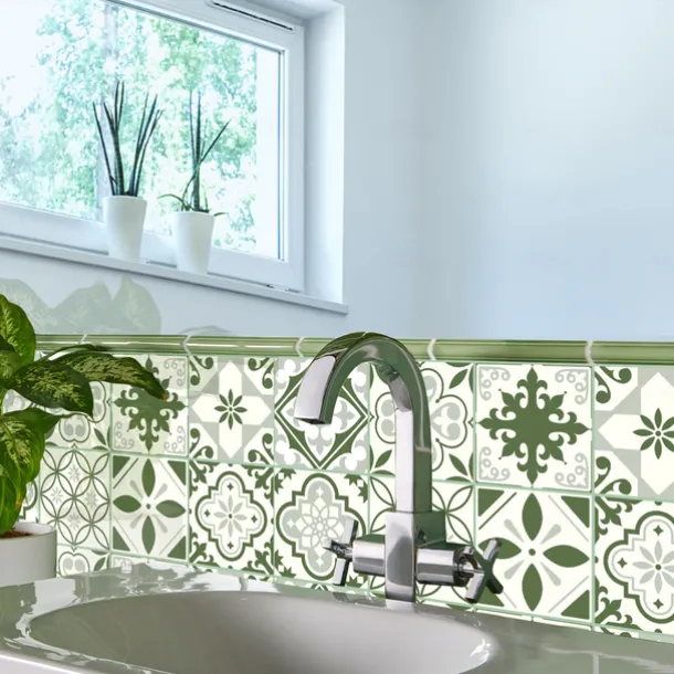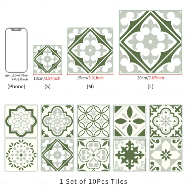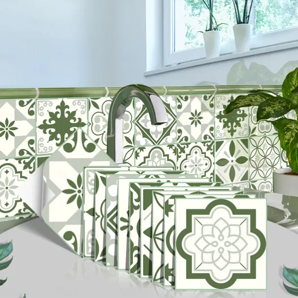 10PCS Kitchen Thickened Green Tile Stickers Self-adhesive Paper Green Tile Tile Sticker Bathroom Oil-proof Waterproof Removable Wall Sticker Floor Sticker