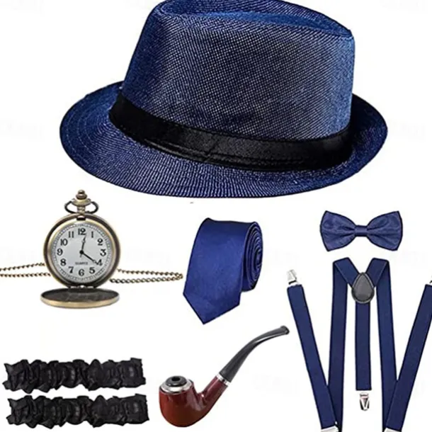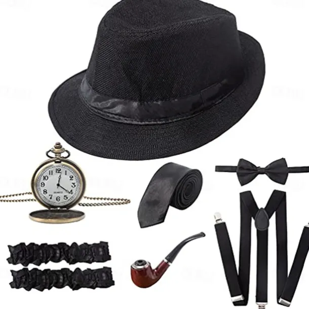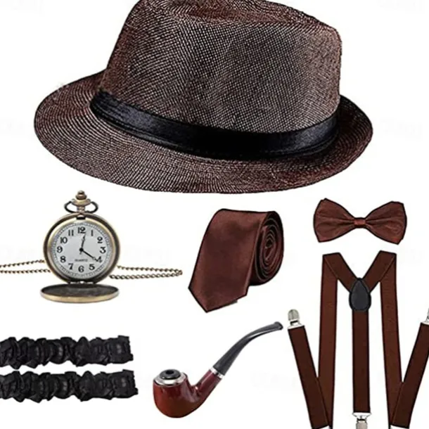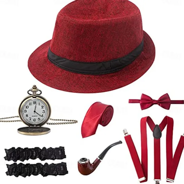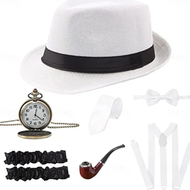 1920s Men’s Costume Accessories Set Gangster Manhattan Hat Pre Tied Bow Tie Pocket Watch Y-Back Suspender Armband Garte For Theme Party 7 Pcs