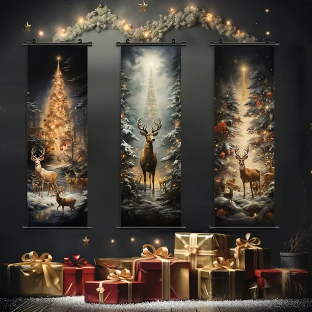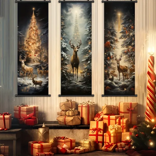 1pc Christmas Poster with Hangers Courtyard Christmas Deer And Colorful Christmas Tree Wall Art Canvas Posters Art For Home Living Room Decoration Wall Art Decor