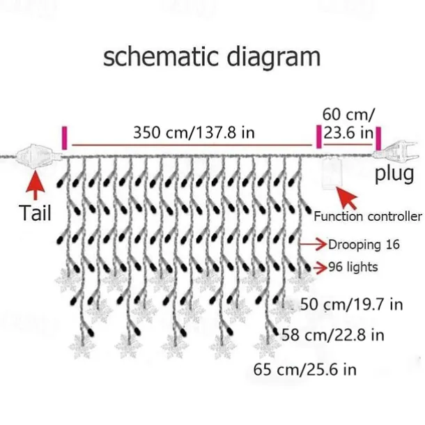 LED Beads Quantity: 96, Light Color: Warm White, White, Multi Color, Power Supply: Plug, Type: Christmas Curtain Light, String Lights, Style: Christmas, Holiday Lights, New Year’s, Features: Curtain String Lights, Christmas Wedding Decoration, Wedding, Waterproof, Decorative, Quantity: 1PC, Voltage (V): 110-120, 220-240, Initial Lumens (lm): 300, Length: 3.5m, Mode: 8 Modes: (1.Combination 2.Wave 3.Sequential 4.Glow 5.Flash 6.Slow Fade 7.Twinkle 8.Continuous), Batteries Included: No, IP Rating: IP65, Control Mode: Mode Switching, Suitable Rooms: Dorm, Hallway, Dining Room, Bedroom, Living Room, Shape: Snowflake, Occasion: Window / Curtain / Wall,