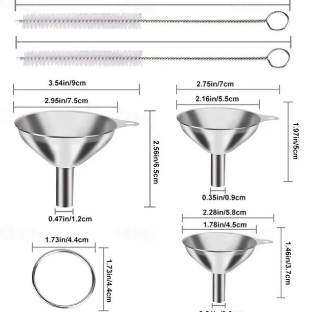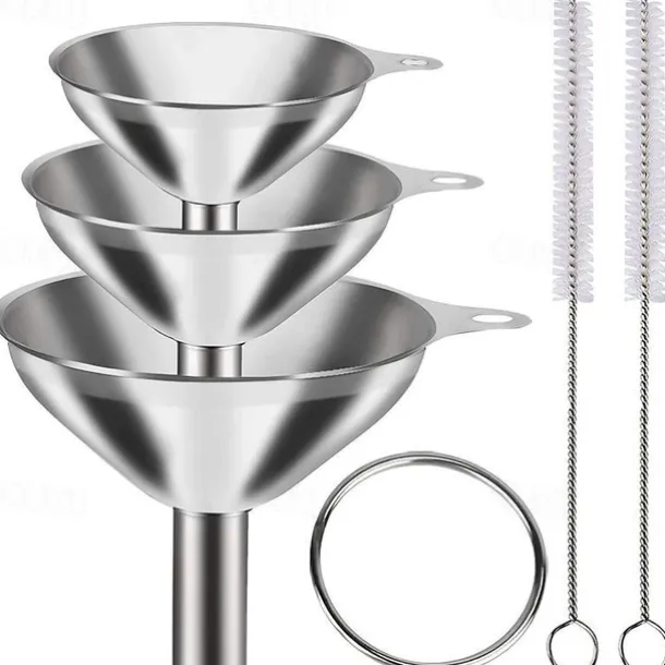 3/5pcs Stainless Steel Funnels For Kitchen Use, Large Tiny Small Funnel Set Of 3, Metal Cooking Powder Food Grade Flask Funnels For Filling Bottles Liquor Water Spice, 2pcs Cleaning Brushes