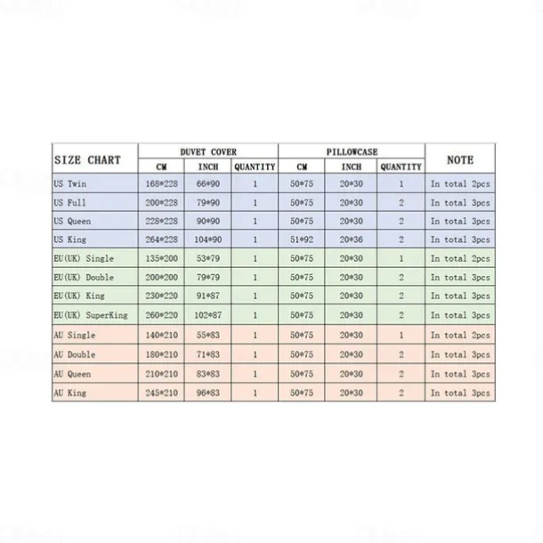 | Size | EU / UK Double, EU / UK King, EU / UK Single, EU / UK SuperKing, US Full, US King, US Queen, US Twin |