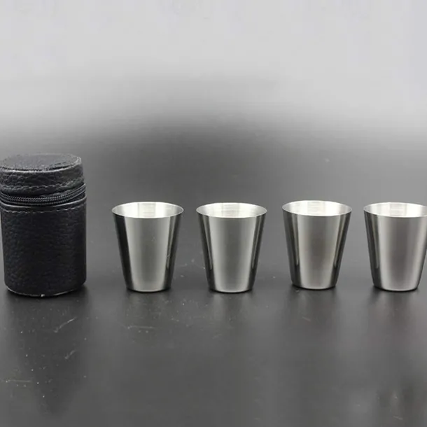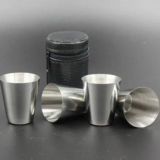 4 Stainless Steel Shot Cups Drinking Vessel with Black Leather Carrying Case (30ml) Outdoor Camping Travel Unbreakable Metal Shooters for Whiskey Tequila Liquor Great Barware Gift
