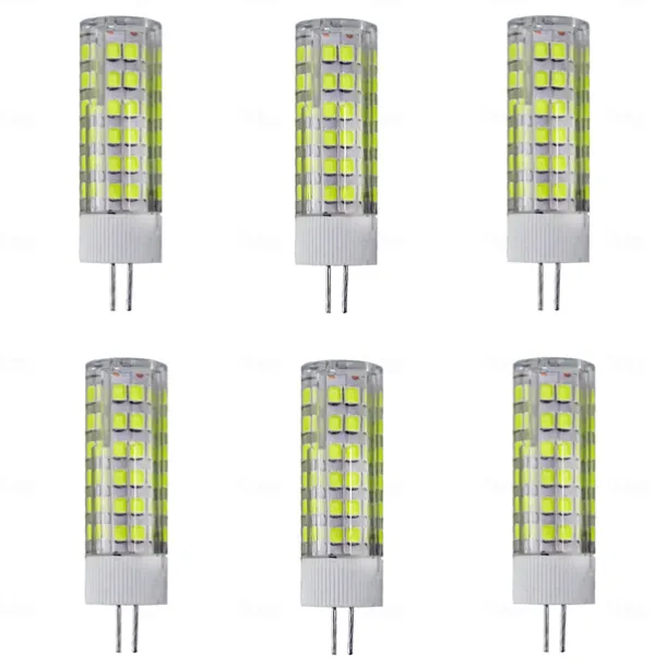 Quantity: 6pcs, LED Beads Quantity: 75, Light Color: Warm White, White, Type: LED Bi-pin Lights, Wattage (W): 7, Voltage (V): 220, Initial Lumens (lm): 400, Color Temperature (k): 3000/6500, Lifetime (H): >15000, Beam Angle: 360°, CRI: >70, Bulb Shape: T, LED Type: SMD 2835, Bulb Base: G4, Net Weight (kg): 0.01,