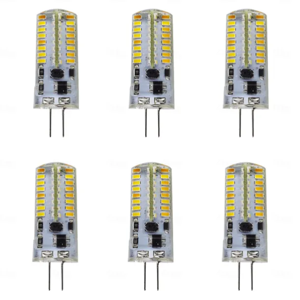 Quantity: 6pcs, LED Beads Quantity: 64, Type: LED Bi-pin Lights, Wattage (W): 5, Voltage (V): 12, Initial Lumens (lm): 480, Color Temperature (k): 3000/6500, Lifetime (H): >15000, Beam Angle: 360°, CRI: >70, Bulb Shape: T, LED Type: SMD 3014, Bulb Base: G4,