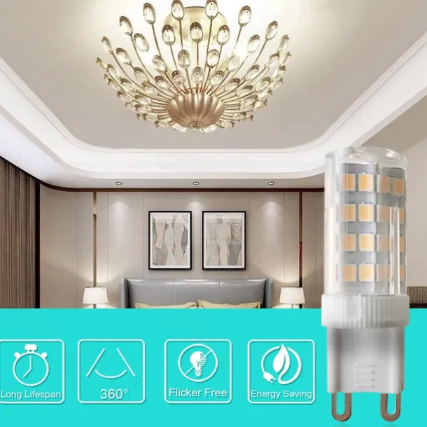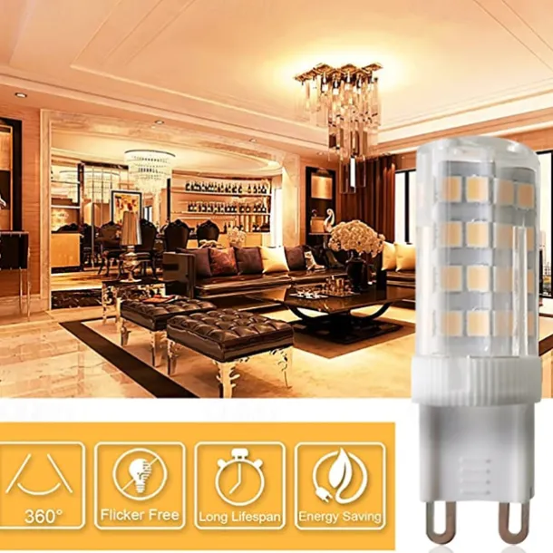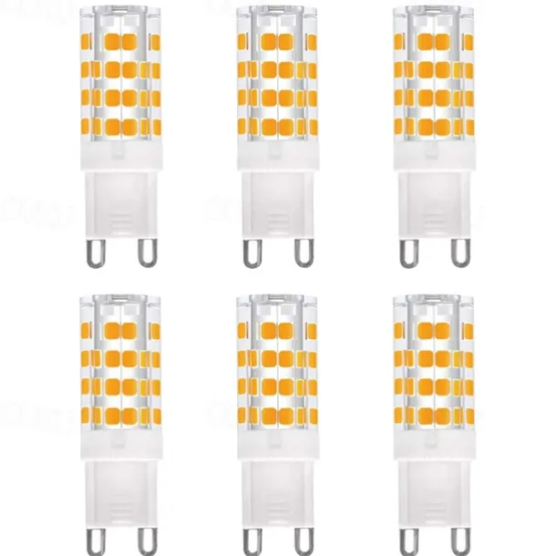 Quantity: 6pcs, LED Beads Quantity: 52, Light Color: Warm White, Cold White, Type: LED Bi-pin Lights, Wattage (W): 4, Voltage (V): 110-240, Initial Lumens (lm): 400, Color Temperature (k): 3000-6000, Beam Angle: 360°, CRI: >80, Primary Application: Home / Office, Living Room / Dining Room, Bedroom, Bulb Shape: T, LED Type: SMD 2835, Bulb Base: G9, Dimension (cm): 1.6*5.1,