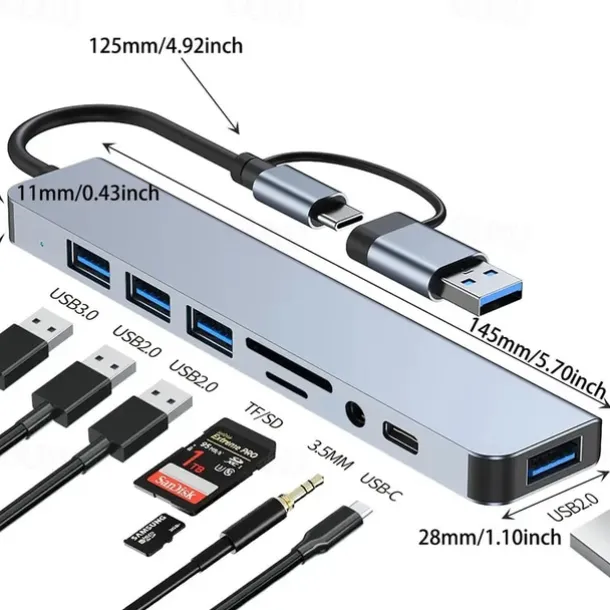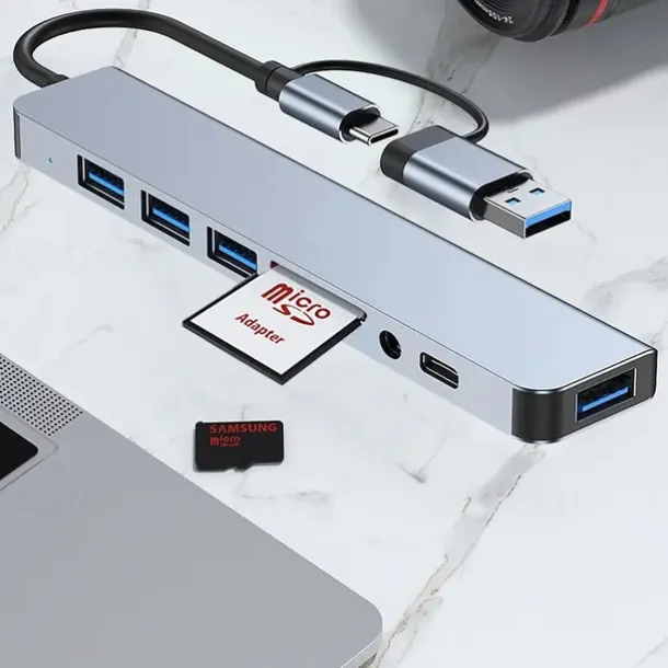 8 In 1 USB Hub Dual Purpose Hub With USB & Type C Interfaces 8-port USB C Hub With USB 3.0 USB 2.0 Micro SD/TF Card Reader Microphone/audio & Other Interfaces