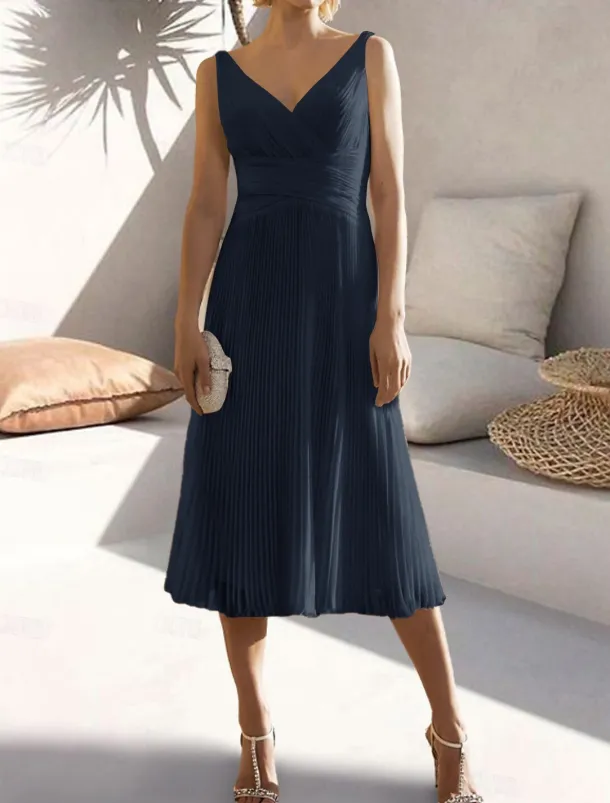 A-Line Cocktail Dresses Elegant Dress Formal Wedding Guest Tea Length Sleeveless V Neck Chiffon with Ruched Pure Color Dresses