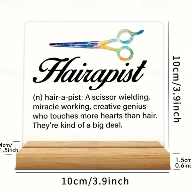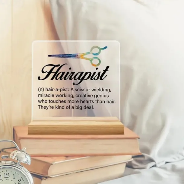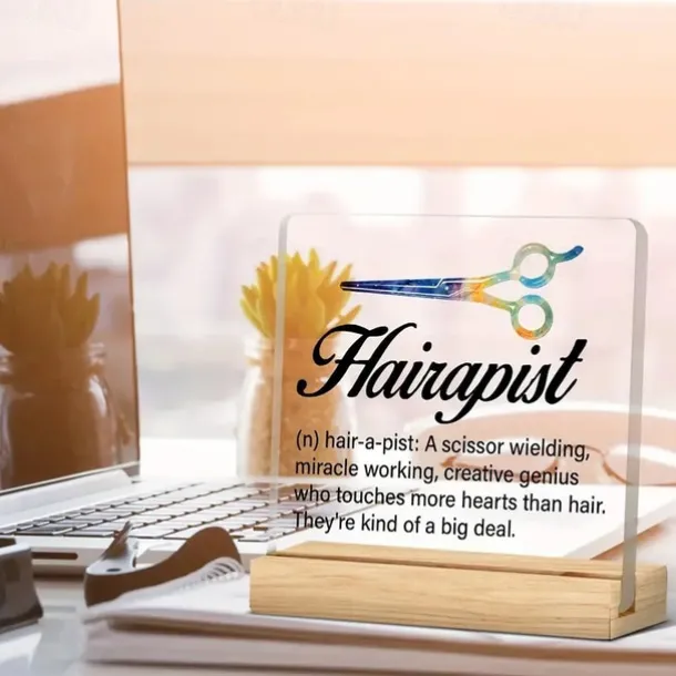 Acrylic Plaque with Wooden Base, Hair Stylist Definition Desk Sign, Creative Scissor Design, Appreciation Gift for Salon Professionals, Horizontal Display