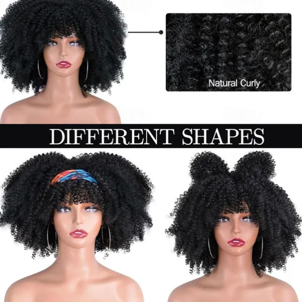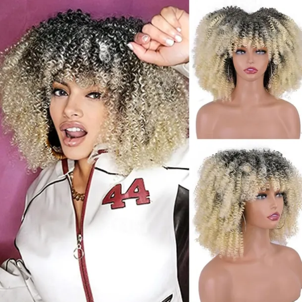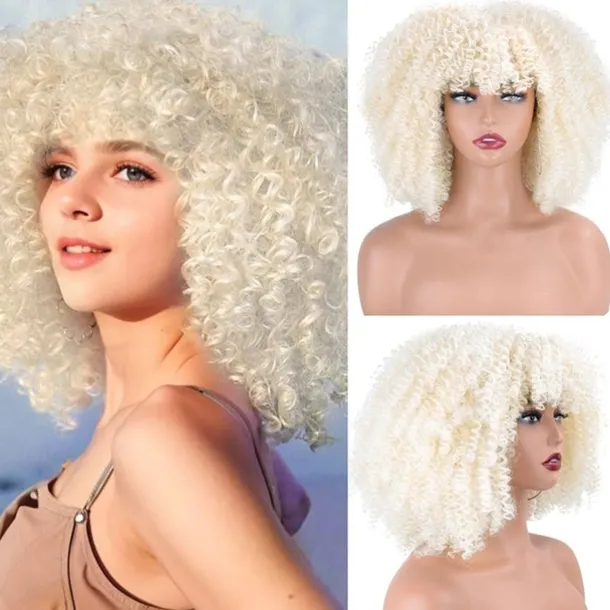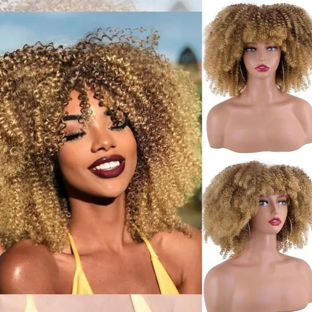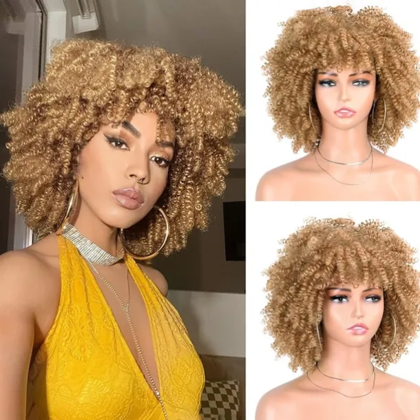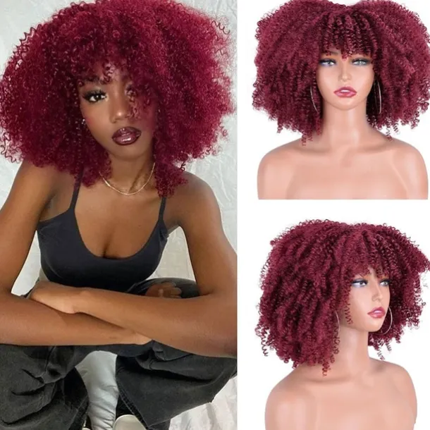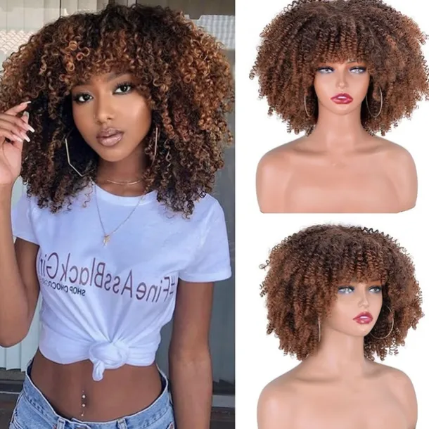 Afro Kinky Curly Wig with Bangs 12 Inches Synthetic Full Wigs Heat Resistant Short Kinky Curly Wigs for Daily Party Halloween Wigs