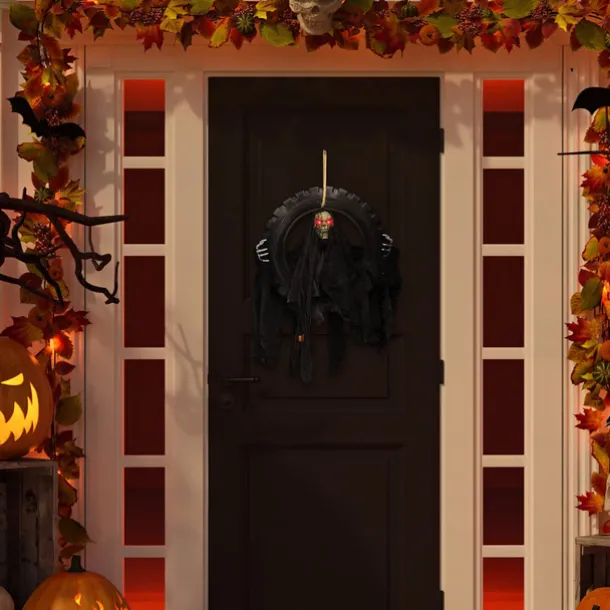 Animated Halloween Wreath Decoration Prop for Front Door Talking and Moving Black Grim Reaper Haunted House Decor