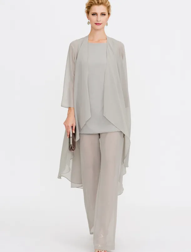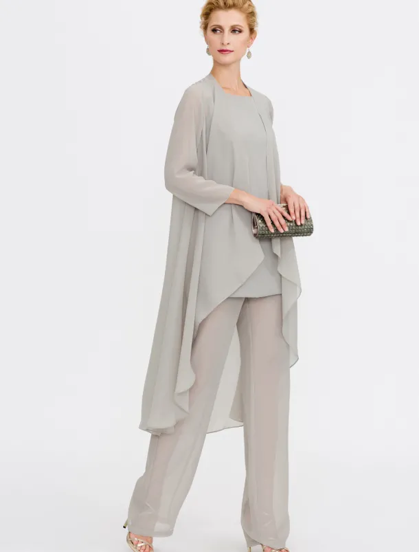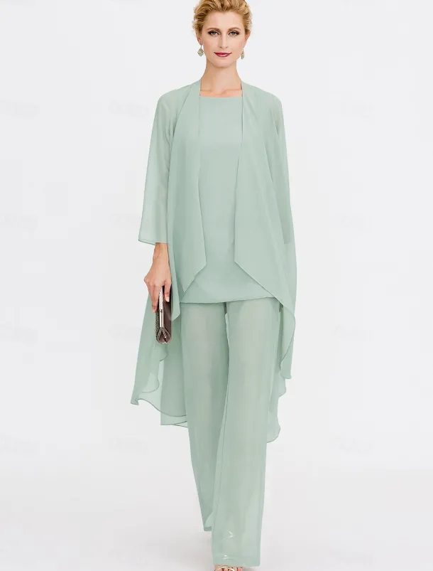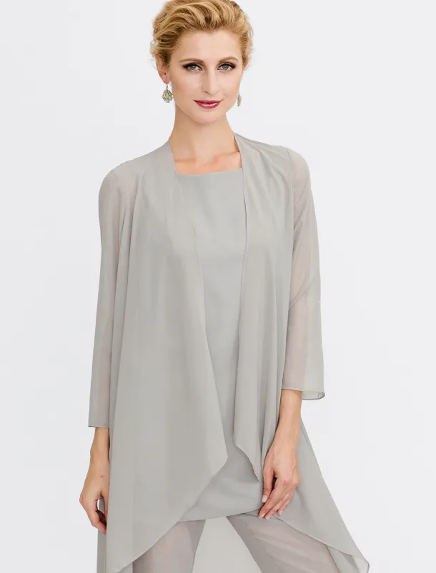 Beach Wedding Jumpsuit/Pantsuit 3 Piece Mother of the Bride Wedding Guest Elegant Plus Size Included Bateau Neck Floor Length Chiffon Sleeveless Jacket es with Solid Color