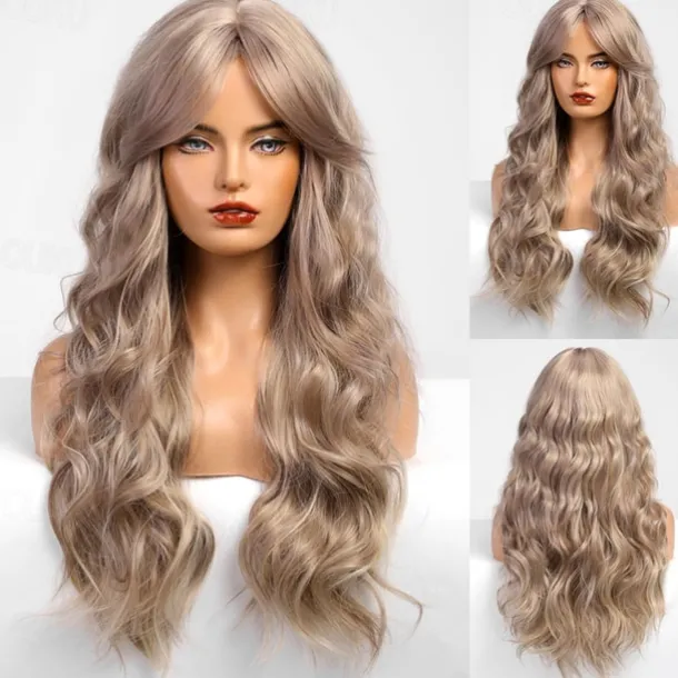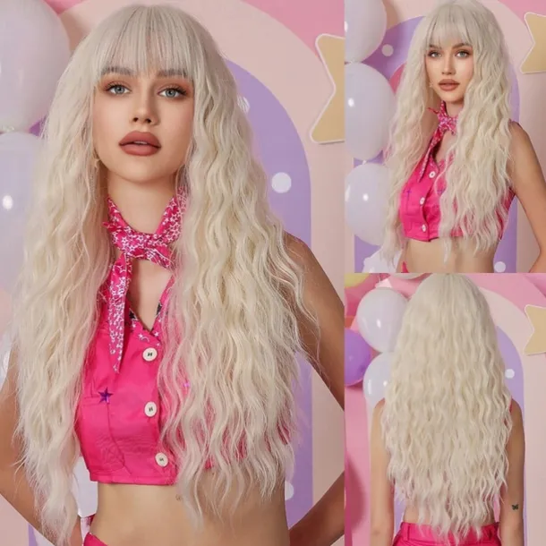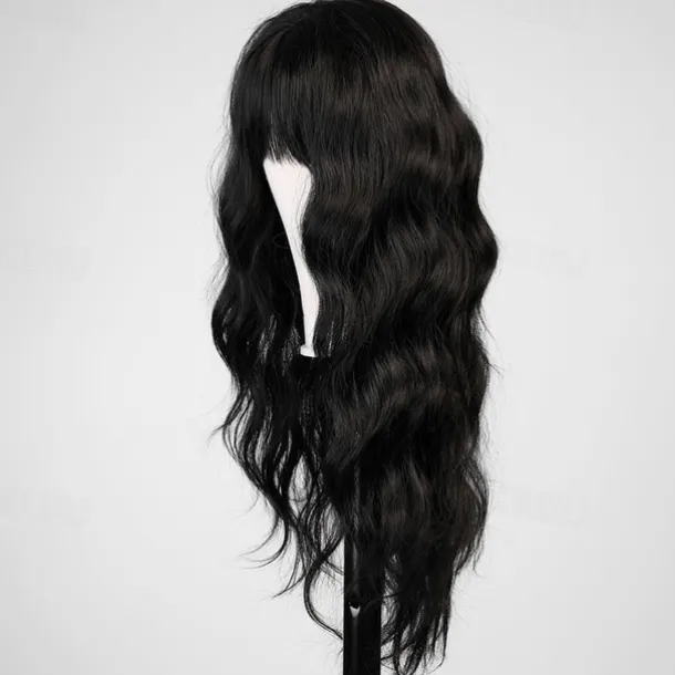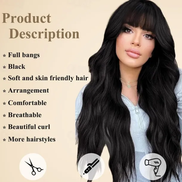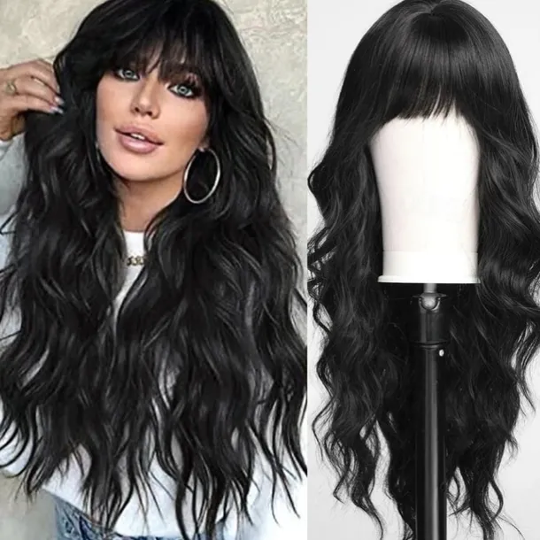 Black Wig with Bangs for Women Long Wavy Hair Wig Black Wig Curly Wavy Synthetic Wigs for Girls Daily Party Use