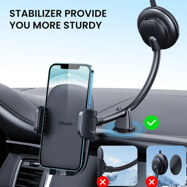 7) Our mount offers increased stability and flexibility thanks to our “U” anti-shake stabilizer that fixes the phone stably while reducing the load-bearing of the suction cup using the principle of physics support rod. It is 5X more stable and flexible than other car phone mounts on the market.