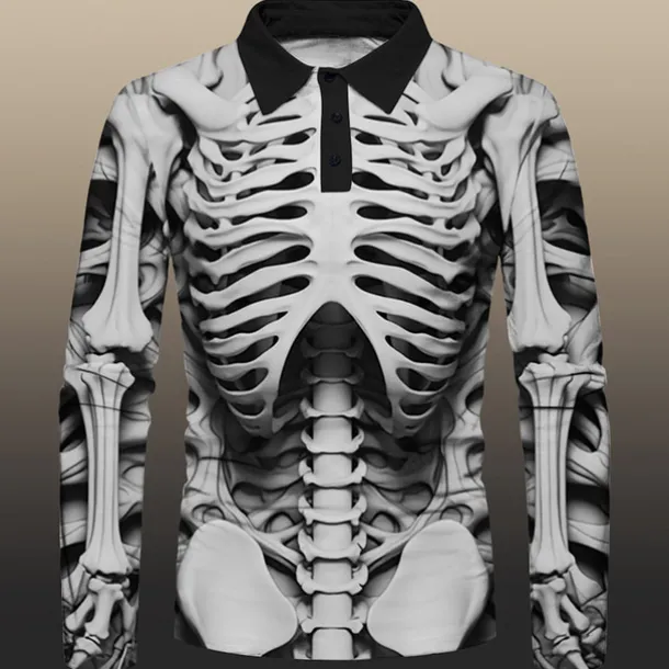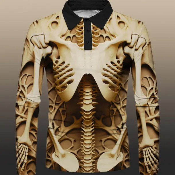 Day of the Dead Men’s Polo Shirts Golf Shirt Long Sleeve Polo Shirts Collared Shirts Casual Horror Festival Wear Party Outfits 3D Print Buttons Fall & Winter Yellow Khaki Gray