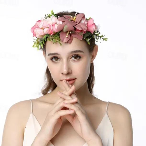 Flower Headband Rose Floral Boho Wreath Garland Hair Hoop Bohemian Headdress Headwear Headpiece Women Girls Crown Leaf Hair Bands Party Decoration Cosplay Costume Handmade Hair Accessories Champagne