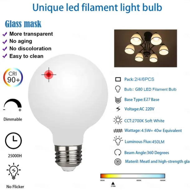 Quantity: 6pcs, 2pcs, 4pcs, LED Beads Quantity: 10, Light Color: Warm White, White, Type: LED Globe Bulbs, Wattage (W): 5, Voltage (V): 220-240, Initial Lumens (lm): 450, Color Temperature (k): 3000/6000, Lifetime (H): >30000, Beam Angle: 270°, CRI: >85, Bulb Shape: D80, LED Type: SMD 2835, Bulb Base: E27, Net Weight (kg): 0.15,