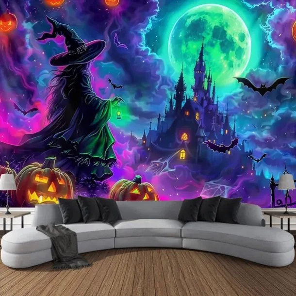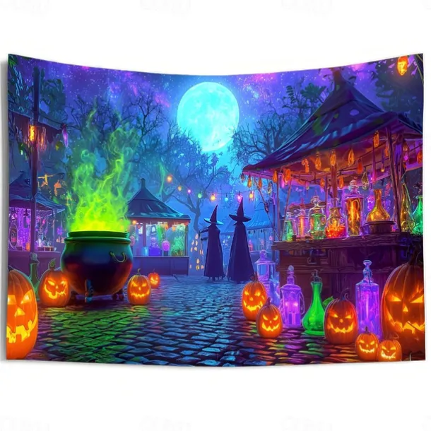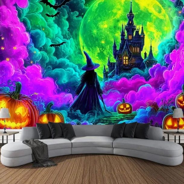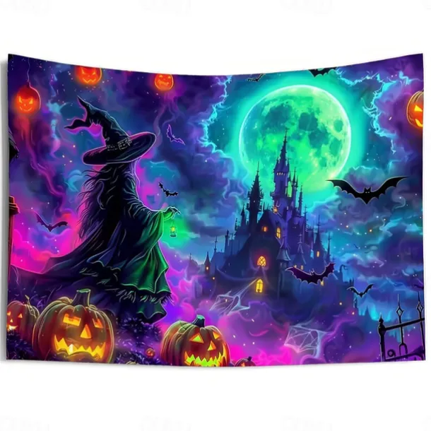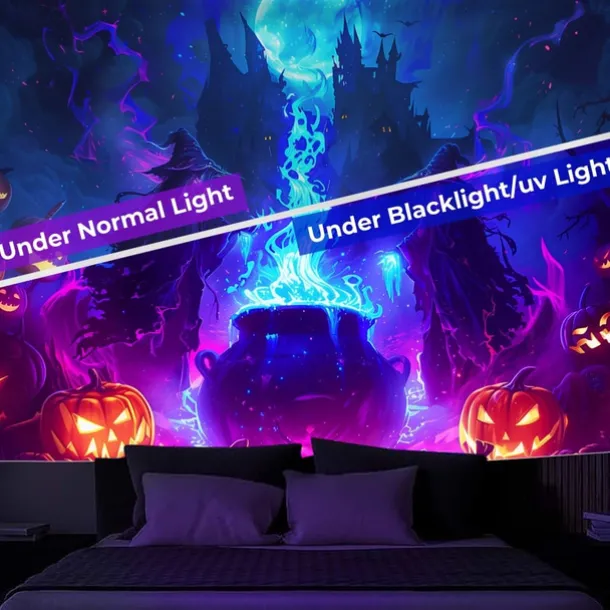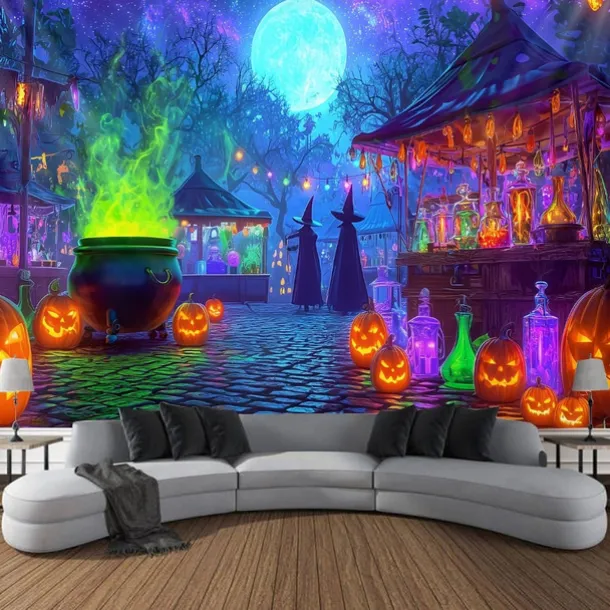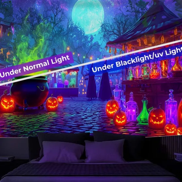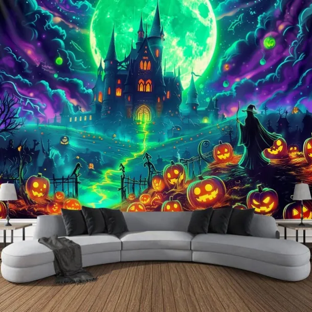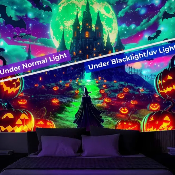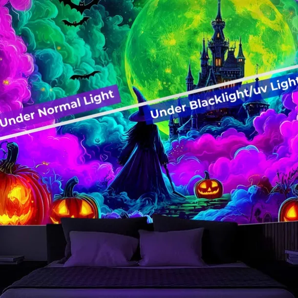 Halloween Blacklight Wall Tapestry – UV Reactive Glowing Moon over Haunted Forest Neon Colors Spooky Night Scene, Glow in the Dark Gothic Wall Hanging for 2025 Halloween Home and Party Decoration