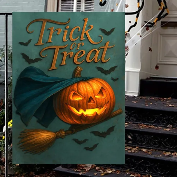 Halloween Garden Flag Banner – “Trick or Treat” Pumpkin with Witch’s Broom, Double-Sided Weather-Resistant Yard Flag for 2025 Halloween Holiday Outdoor Lawn, Porch Decoration