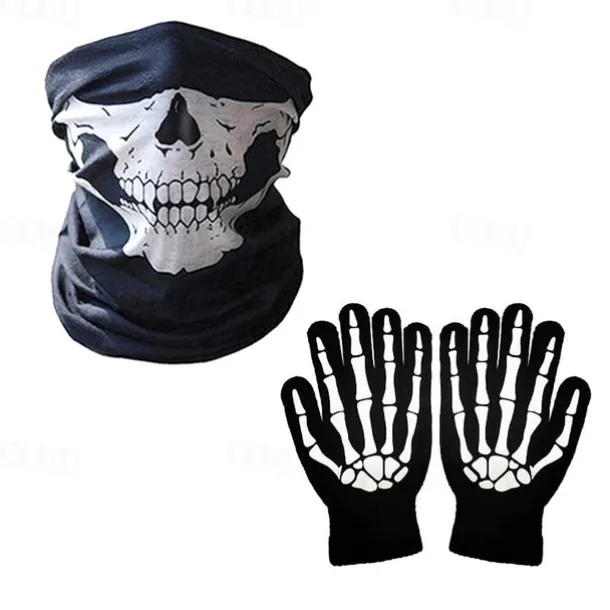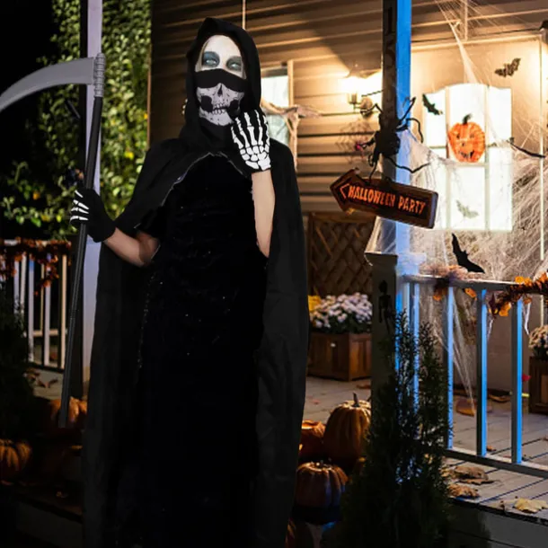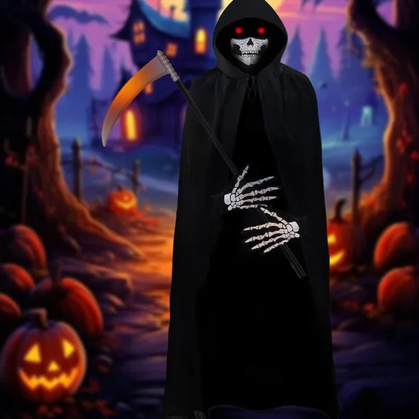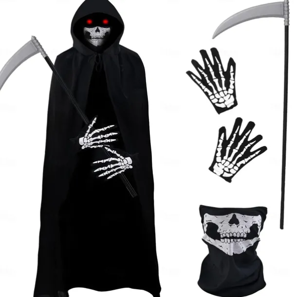 Halloween Grim Reaper Costume Skeleton Skull Outfits 4 PCS Cape with Hood Cloak Plastic Scythe Skull Mask Easy Halloween Costumes Carnival for Men Adults