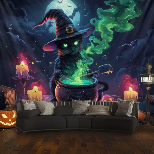 Halloween Hanging Tapestry Black Cat Photograph Backdrop Jack O Lantern Wall Art Large Tapestry Mural Decor Blanket Curtain Home Bedroom Living Room Decoration Death Selfie