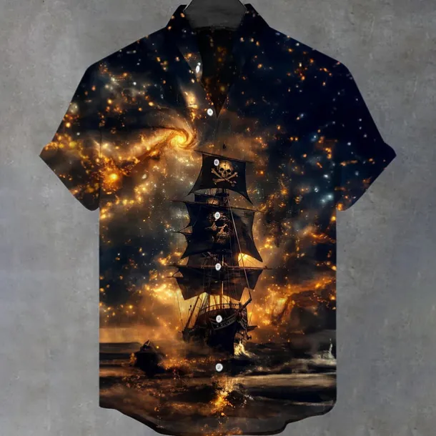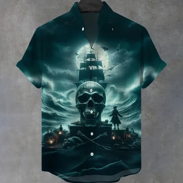 Halloween Men’s Sailboat Halloween Costumes Skulls Shirt Button Up Shirt Stand Collar Shirt Short Sleeve Dark Gothic Style Holiday Summer Spring Mandarin Collar 3D Print Linen Like Shirt Black Blue