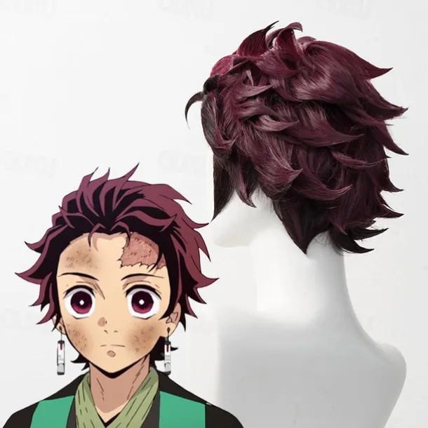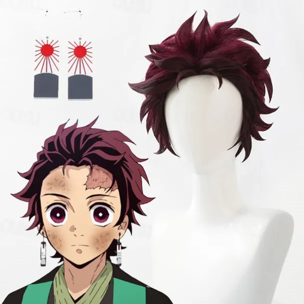 Kimetsu No Yaiba Tanjiro Kamado Short Chestnut Brown Heat Resistant Hair Cosplay Wig A Pair of Ear-Rings Halloween Wigs