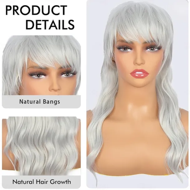 Long Grey Mullet Wig for Women with Bangs 90s 80s Wigs Natural Looking Synthetic Wig With Bangs for Women Wig Halloween Wigs
