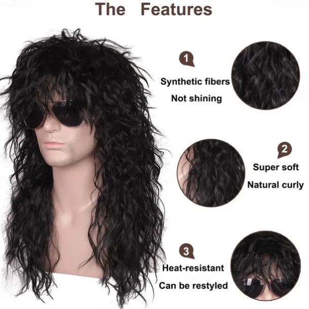 Mens 80s Wig Long Black Curly Wigs Rocker Costume Wig Men Fashion Smart Rocker Style Wig cosplay wig for Carnival