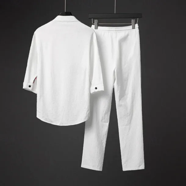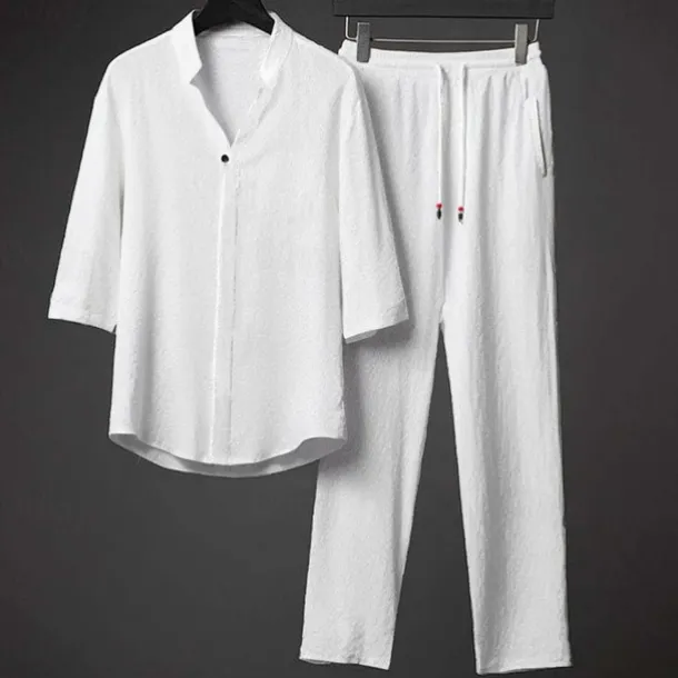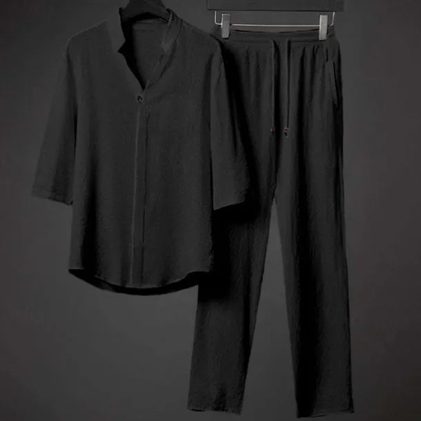 Men’s Band Collar Shirt 2 Piece Shirt Set Summer Set Matching Sets Beach Wear Black White Gray Half Sleeve Solid Colored Collar Outdoor Street Drawstring Clothing Apparel Polyester Comfortable Loose
