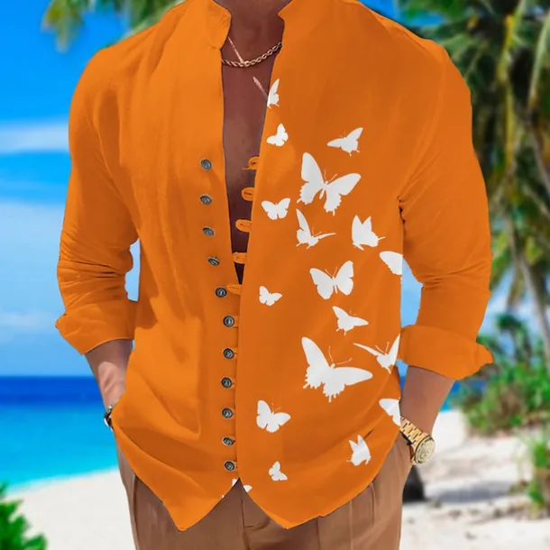 Presenting a limited edition Men’s Linen Shirt in collaboration with top designers This comfortable and fashionable shirt is adorned with unique butterfly graphic prints on a stand collar The long-sleeved piece made of soft polyester provides micro-elasticity for a perfect fit Individually hand dyed it’s machine washable and an ideal choice for any casual or outdoor events Be ready to stand out — just like you!