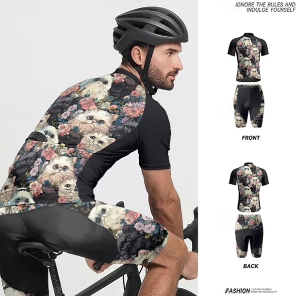 Men’s Cycling Jersey with Shorts Cat Floral Botanical Short Sleeve Bike Clothing Suit with 3 Rear Pockets Mountain Bike MTB Road Bike Cycling Front Zipper Sweat wicking Comfortable Breathable Sports