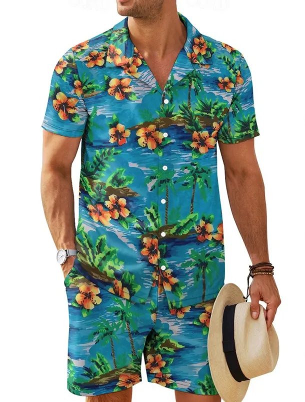 Men’s Floral 2pcs Shirts Sets Summer Tops Short Sleeve Short Pants Turndown Vacation Home Casual Daily 3D Print Summer Robin’s Egg Blue Light Green Green