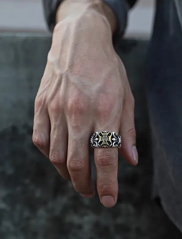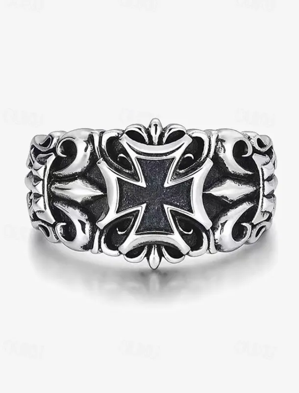 Men’s Gothic Silver Ring with Cross Detail – Vintage Style Adjustable Band, Intricate Skull and Cross Design for Punk Rock Fashion