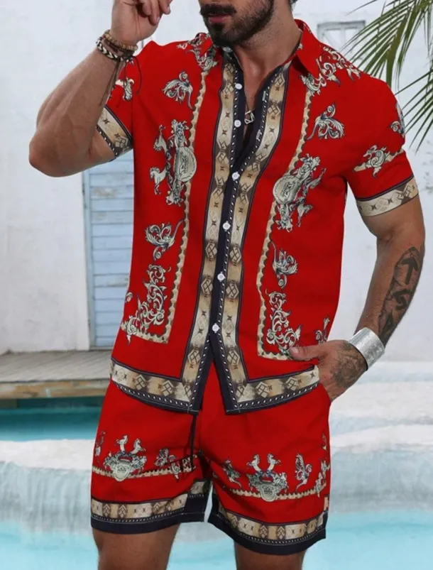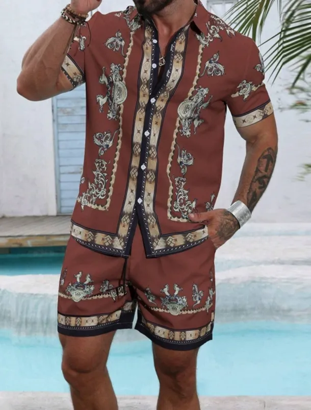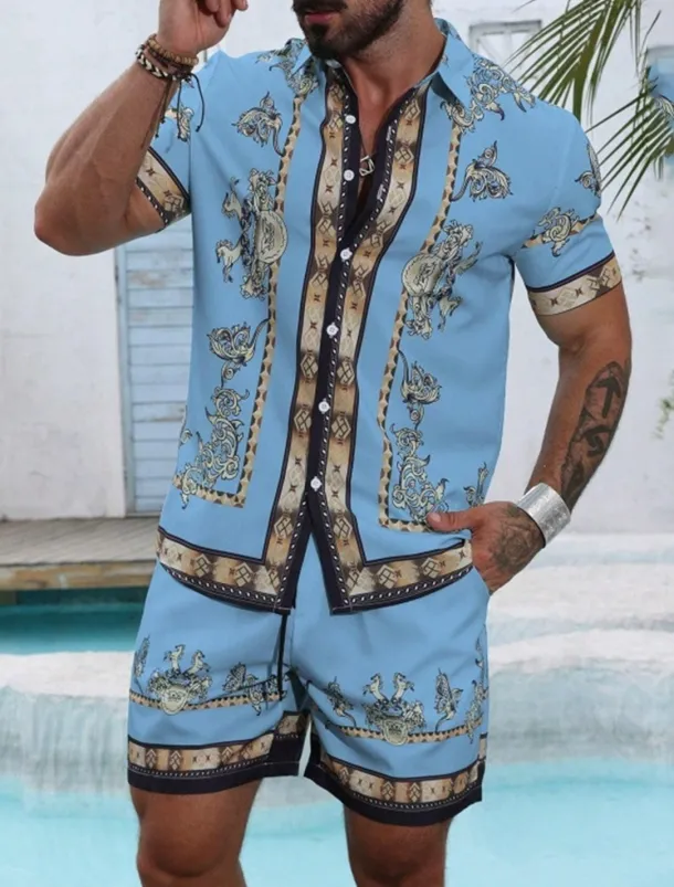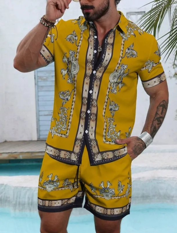 Men’s Graphic 2pcs Shirts Sets Summer Tops Short Sleeve Short Pants Turndown Ethnic Outdoor Casual Daily 3D Print Summer Robin’s Egg Blue Black Yellow