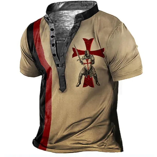 Men’s Graphic Templar Cross Knights Templar T Shirt Henley Shirt Tee Short Sleeve 3D Print Designer Basic Casual Outdoor Daily Sports Summer White Blue Brown Green Coffee Stand Collar Henley T-Shirt