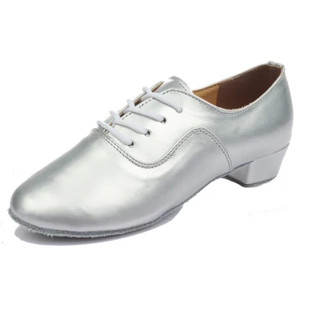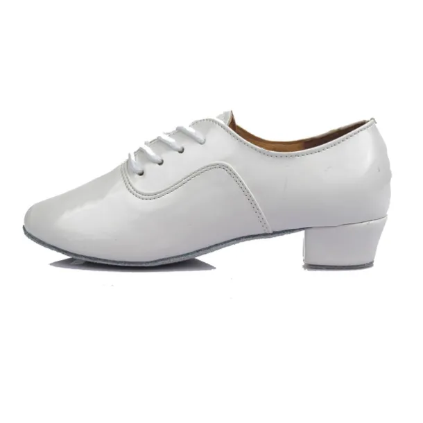Men’s White Patent Leather Lace-Up Dance Shoes – Comfortable Low Heel and Soft Suede Sole for Ballroom and Latin Dance