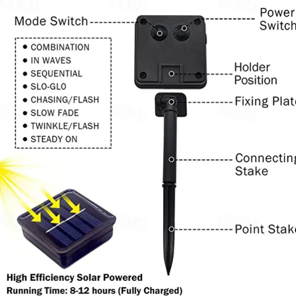 LED Beads Quantity: 70/100/30, Light Color: Warm White, Blue, White, Power Supply: Solar Energy, Type: String Lights, Christmas Tree Lights, Christmas String Lights, Style: Globe / Ball String Lights, Holiday Lights, Features: Solar, Holiday, Waterproof, Wedding, Patio, Quantity: 1PC, Voltage (V): Solar Powered, Initial Lumens (lm): 400, Length: 7m, 12m, 6.5m, Mode: 8 Modes: (1.Combination 2.Wave 3.Sequential 4.Glow 5.Flash 6.Slow Fade 7.Twinkle 8.Continuous), CRI: >75, LED Type: EL, Batteries Included: Yes, IP Rating: IP65, Control Mode: Button, Light Control, Occasion: Patio, Wedding, Party / Banquet, Outdoor, Garden, What’s in the box: 1Set Mounting Bracket,