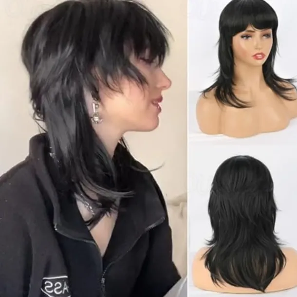Mullet Wigs for Black Women Straight Wolf Cut Wig Mullet Wig Layered Mullet Wigs with Bangs Soft Synthetic Shag 80s 90s Mullet Wigs for Women Rocker Cosplay Wig Halloween Wigs