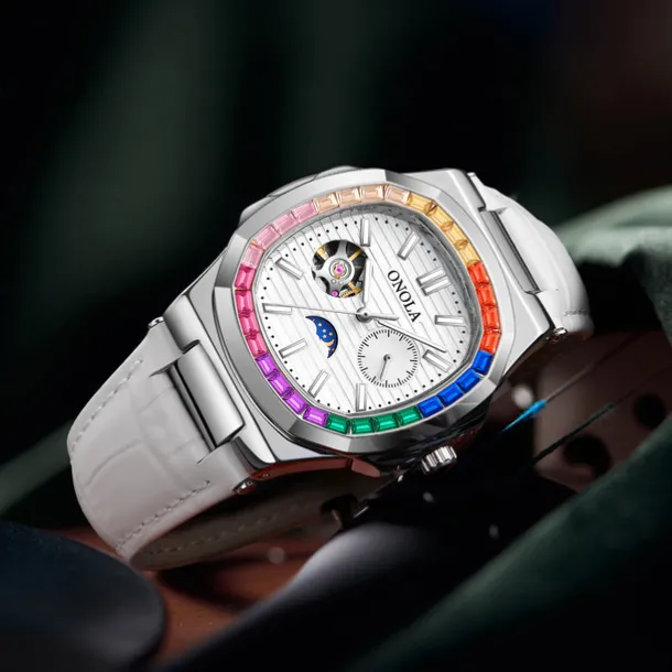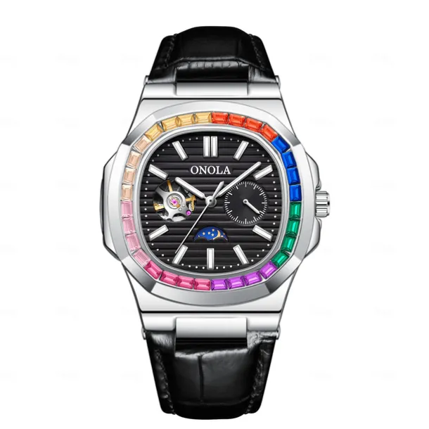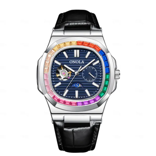 ONOLA Men Mechanical Watch Fashion Business Wristwatch Automatic Self-winding Moon phase Luminous Waterproof Leather Watch
