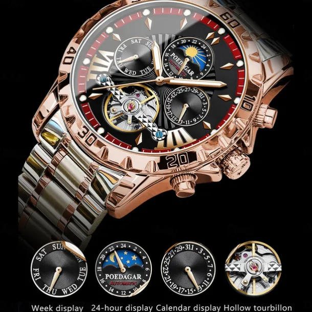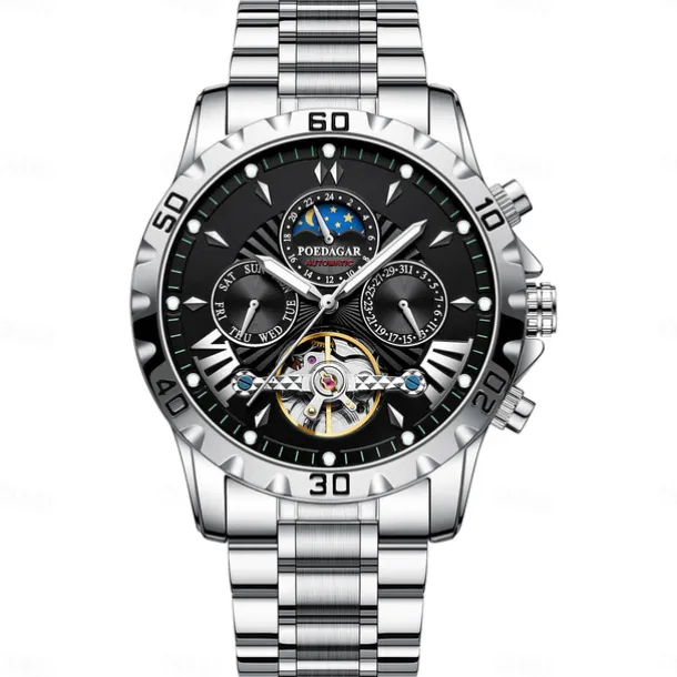 POEDAGAR Men Mechanical Watch Fashion Casual Wristwatch Automatic Self-winding Moon phase Luminous Waterproof Steel Watch