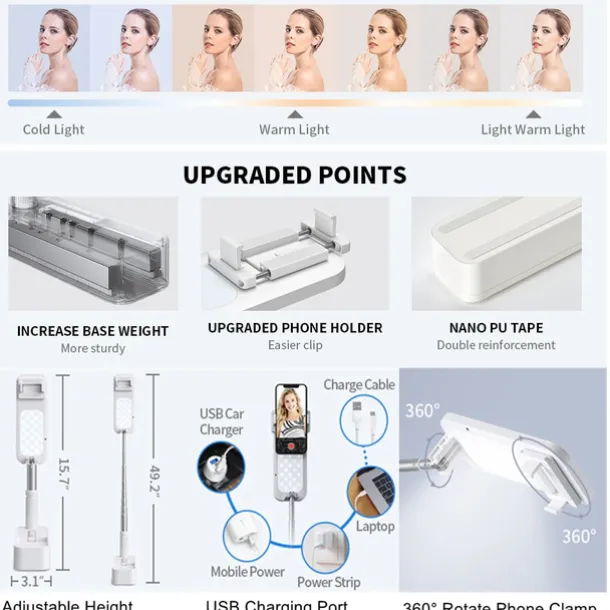 2. Our portable ring light is designed for easy transportation, with a fully adjustable height and folding function. It can be adjusted to 8 different heights and the 360 degree rotatable smartphone holder can be used in portrait or landscape mode.