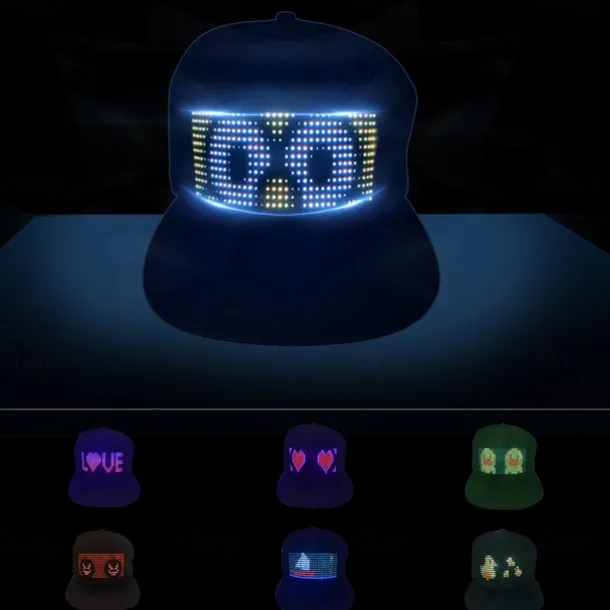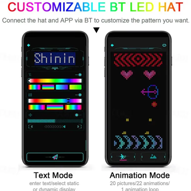2. Customizable pictures and animations: With 20 pictures and 22 animations, you can easily customize the displayed patterns on the hat surfaces via the accompanying APP.