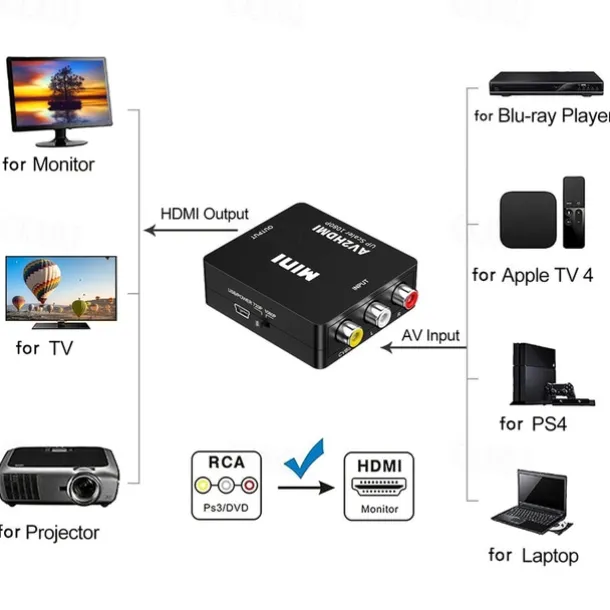 RCA To HDMI AV To HDMI Converter 1080P Mini RCA Composite CVBS Video Audio Converter Adapter Supporting PAL/NTSC For TV/PC/ PS3/ STB/Xbox VHS/VCR/Blue-Ray DVD Players