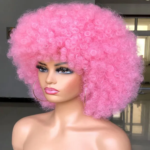 Short Afro Wig with Bangs for Black Women Afro Kinky Curly Wig 70s Premium Synthetic Big Afro Wig