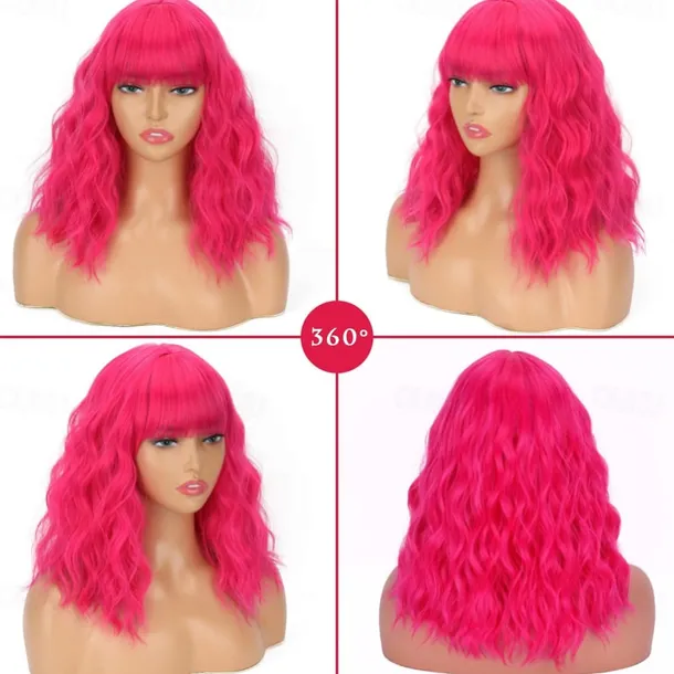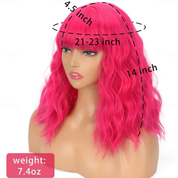 Short Pink Wigs for Women Short Wavy Hot Pink Wigs with Bangs Synthetic Pink Curly Bob Wig Curly Shoulder Length Cosplay Wig for Women Girls Colored Wigs