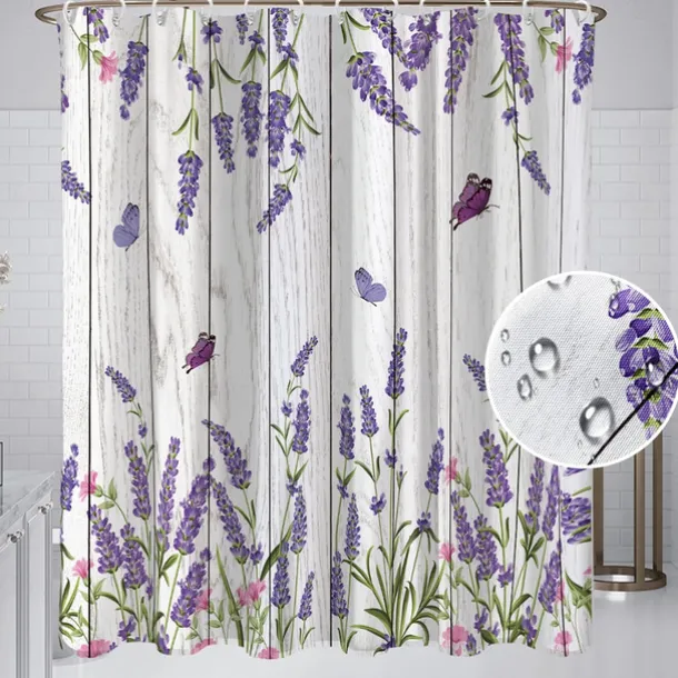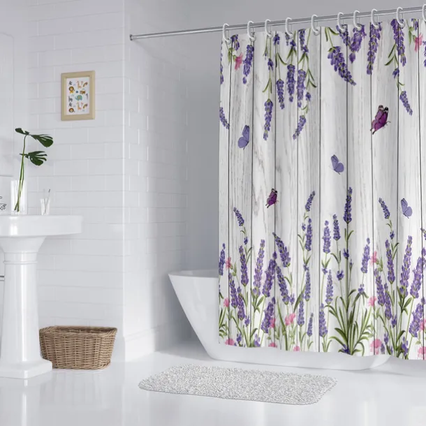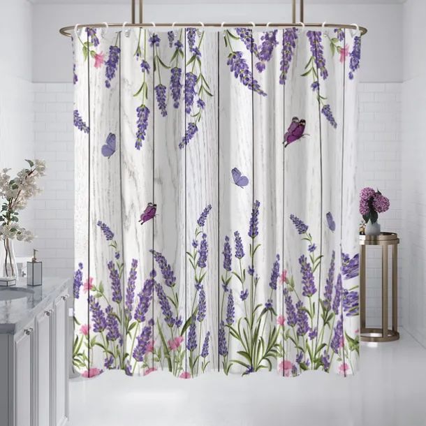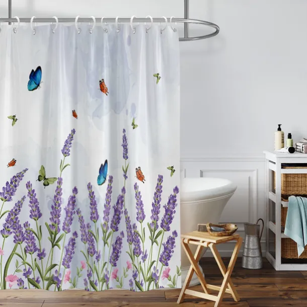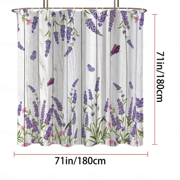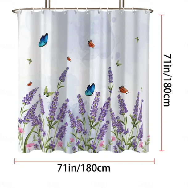 Shower Curtain with Hooks 180cm*180cm(70″*70″) Polyester Washable Waterproof Butterfly Lavender Pattern Bathroom Decor